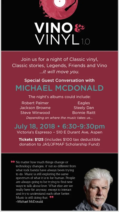 JFMAF/Belly Up partnership presented the inaugural Vino & Vinyl series kicking off at Victoria’s Expresso and Wine Bar with support from JAS staff. The night kicked off with fantastic wines, delicious tapas and classic vinyl walking an enthusiastic audience down memory lane. Michael McDonald of Steely Dan and Doobie Bros fame was our 1st very special guest who gave insights to his life as a legendary musician, songwriter, vocalist and overall incredible human. Stay tuned for V&V 2.0 coming in 2019.